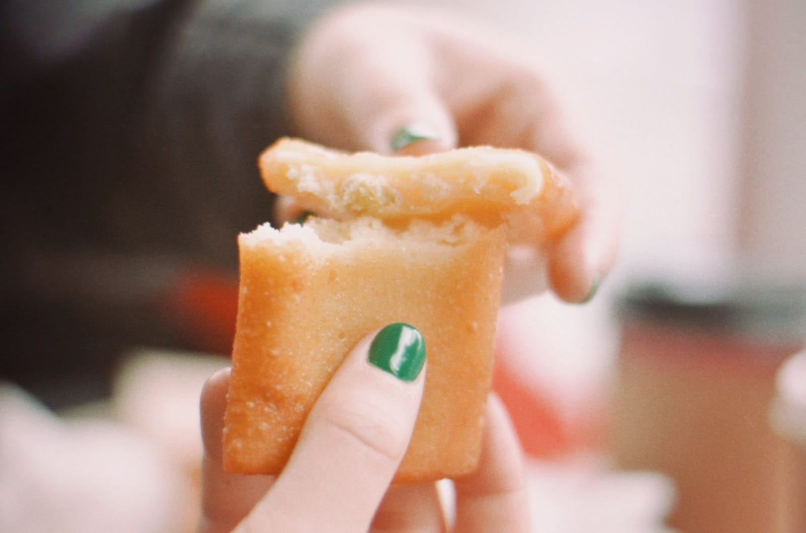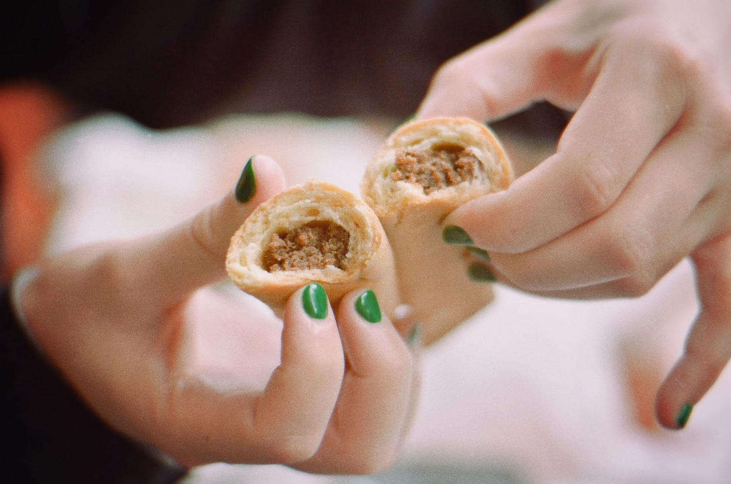 The first one is piroshka with mushroom, egg, and cheese. It kind of feels like a mushroom omelet but it looks very flaky and crispy on the outside. It's a nice golden color. It looks a little more like golden brown than are some of the other things we have in front of us.